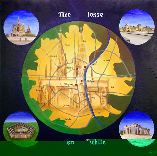 Auftraggeber: Galerie "von Meyburg"Ausführung: Mischtechnik auf Leinwand (L. Fanslau, AnneMarie Siber)Vorlage: "Mer Losse d'r Dom en Kölle"(Bläck Fööss)Designer: AnneMarie Siber